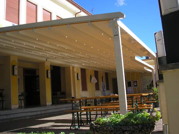 Mettiamo a disposizione dei nostri clienti pergole in alluminio verniciato munite di telo Fly in PVC. La presenza del telo garantisce la totale protezione dai raggi UV. Inoltre, la particolare configurazione del telo in trazione permette lo scarico dell’acqua ai quattro angoli della struttura, grazie a speciali grondaie montate su ogni gamba.